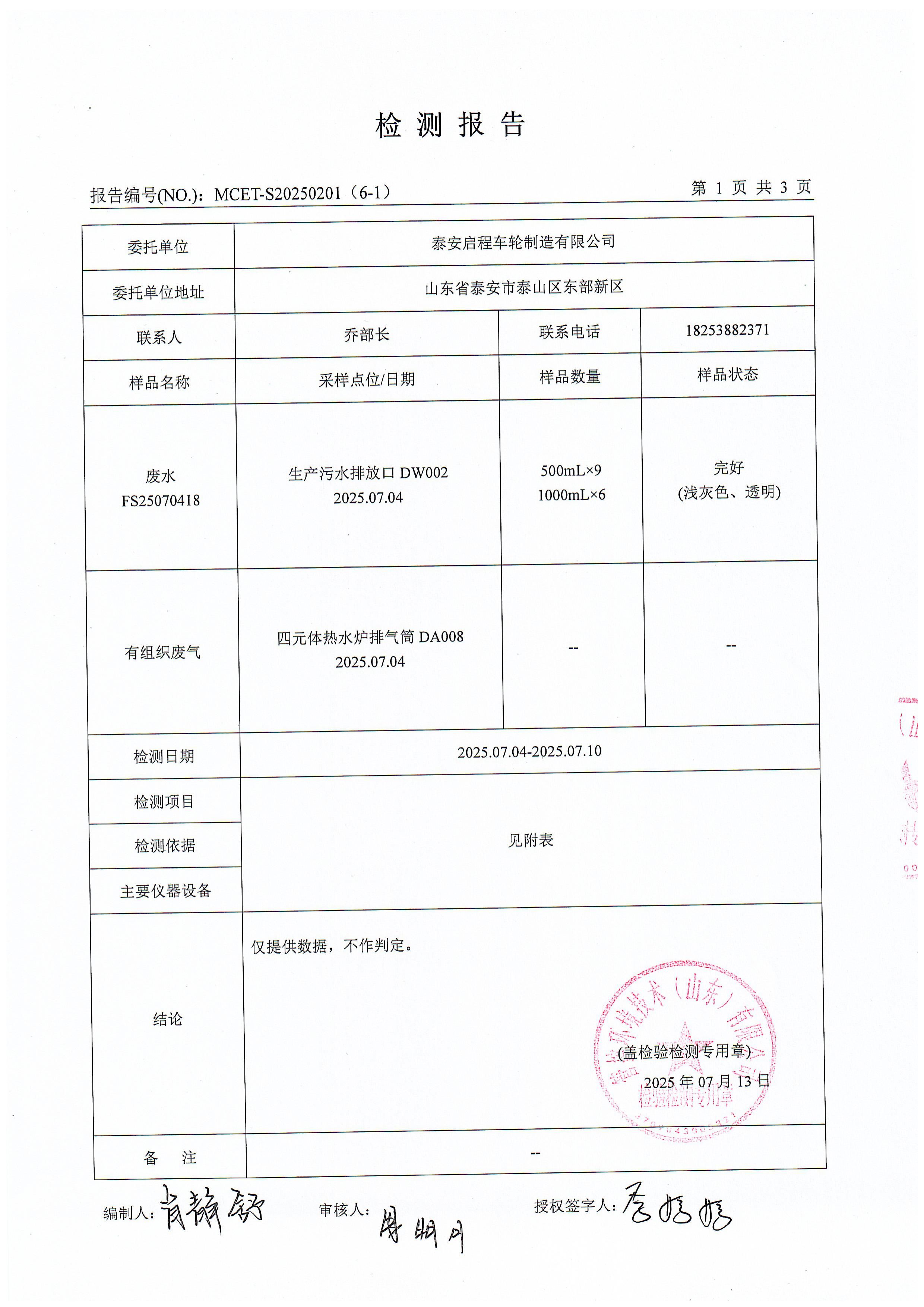 泰安啟程車輪制造有限公司2025年7月份環(huán)境污染物排放檢測(cè)報(bào)告