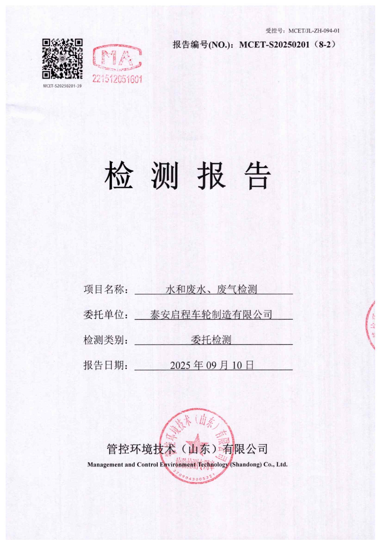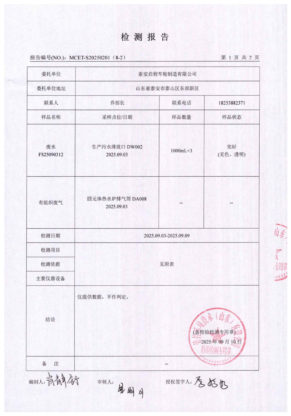 泰安啟程車輪制造有限公司2025年9月份環(huán)境污染物排放檢測報告
