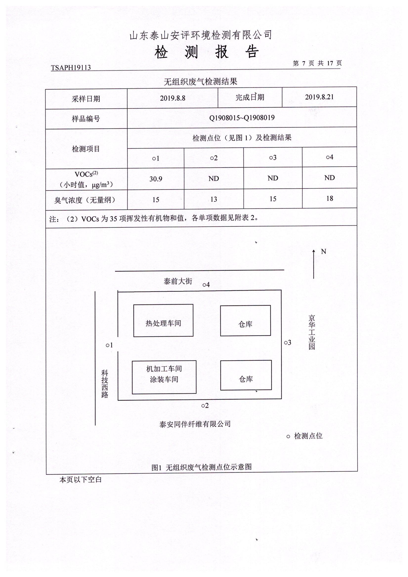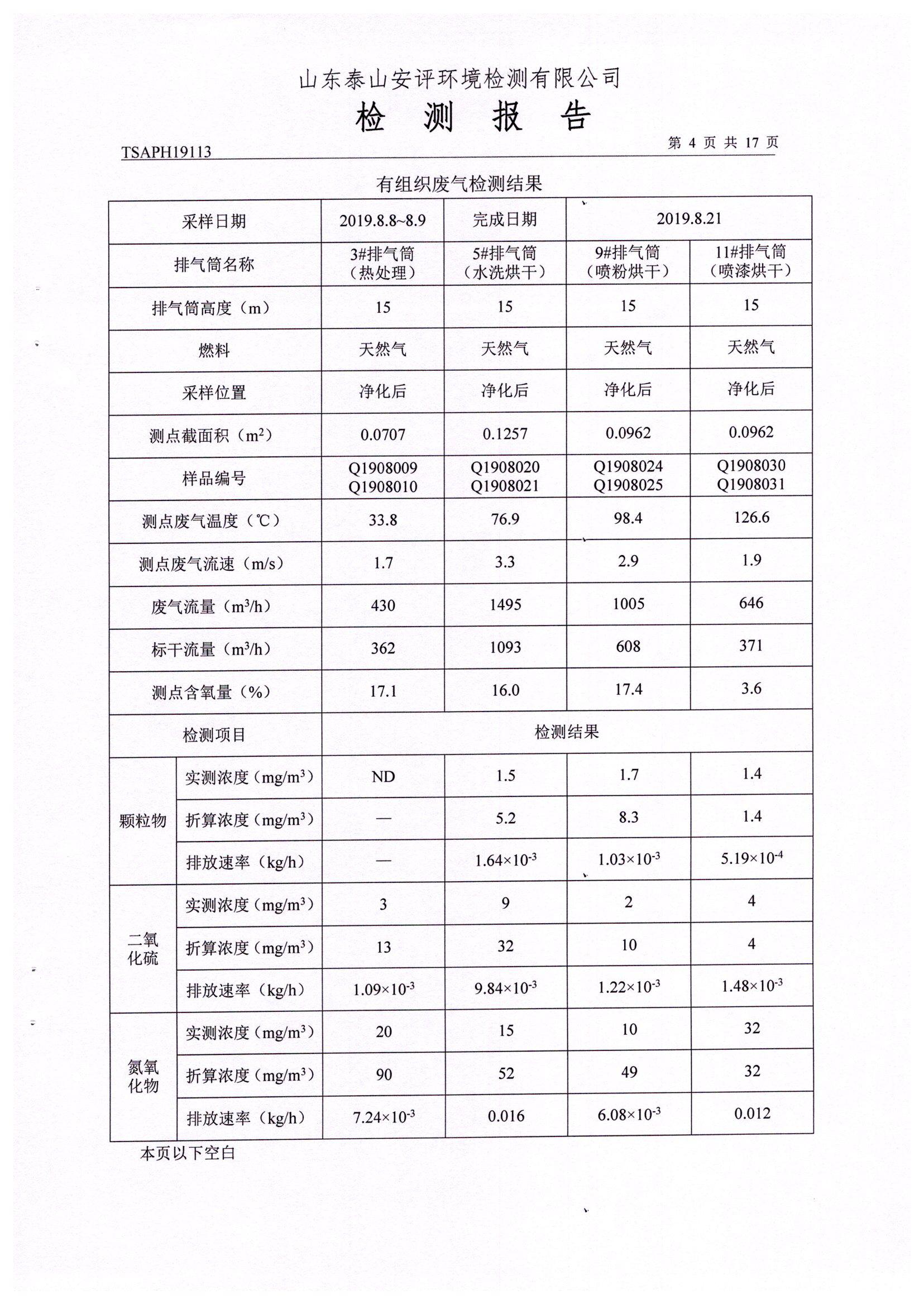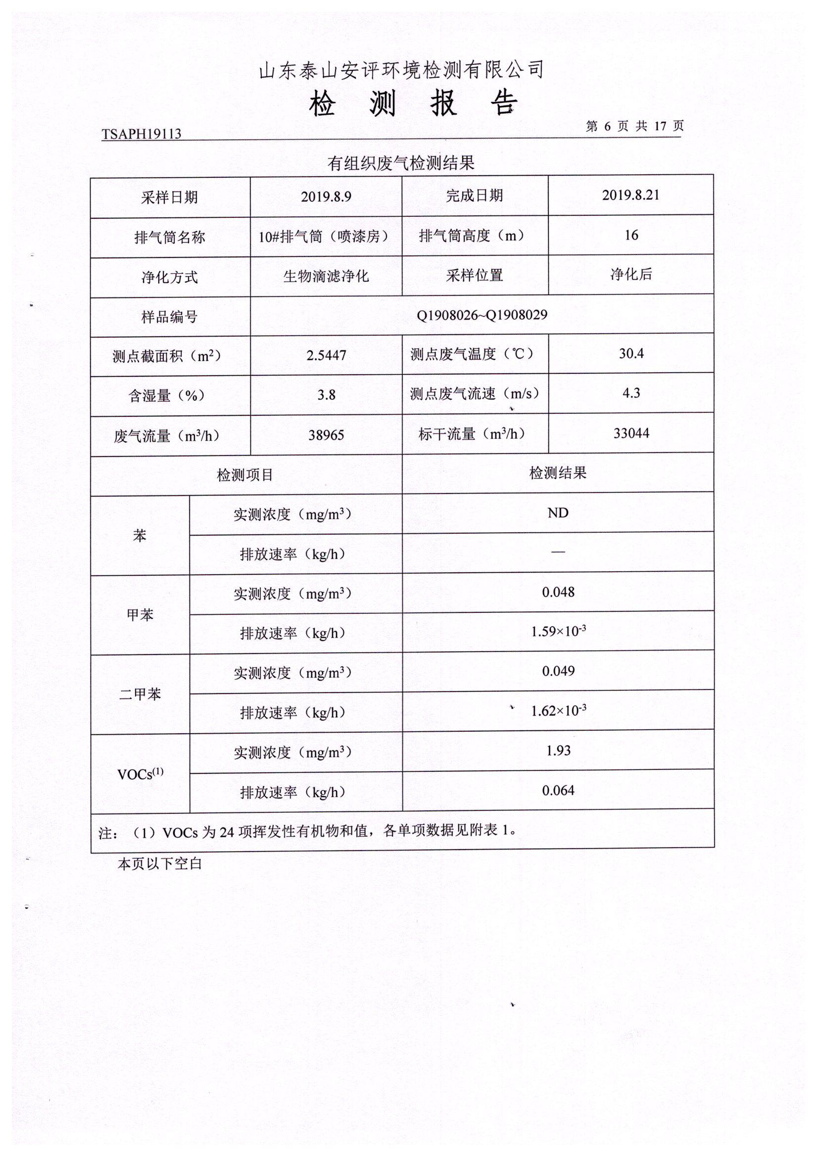 啟程公司主要廢氣排放口位于廠(chǎng)區(qū)北側(cè)和南側(cè):北側(cè)編號(hào)DA001/ DA002,執(zhí)行《山東省區(qū)域性大氣污染物綜合排放標(biāo)準(zhǔn)》(DB37/ 2376—2019)標(biāo)準(zhǔn): SO2≤50 mg/ m3,Nox≤100mg/ m3,顆粒物≤10mg/ m3。實(shí)際排放濃度:SO2 4mg/ m3,Nox 10mg/ m3,顆粒物 5.4mg/ m3。南側(cè)編號(hào)DA010,,執(zhí)行《揮發(fā)性有機(jī)物排放標(biāo)準(zhǔn)第5部分: 表面涂裝行業(yè)》(DB37 2801.5—2018)表2標(biāo)準(zhǔn): 苯≤0.5mg/ m3,甲苯≤1.5mg/ m3,二甲苯≤5mg/ m3,VOCs≤50mg/ m3。實(shí)際排放濃度:苯ND(未檢出),甲苯≤0.049mg/ m3,二甲苯≤0.048mg/ m3,VOCs≤1.93mg/ m3。廢氣排放均經(jīng)過(guò)處理設(shè)施有組織排放。
