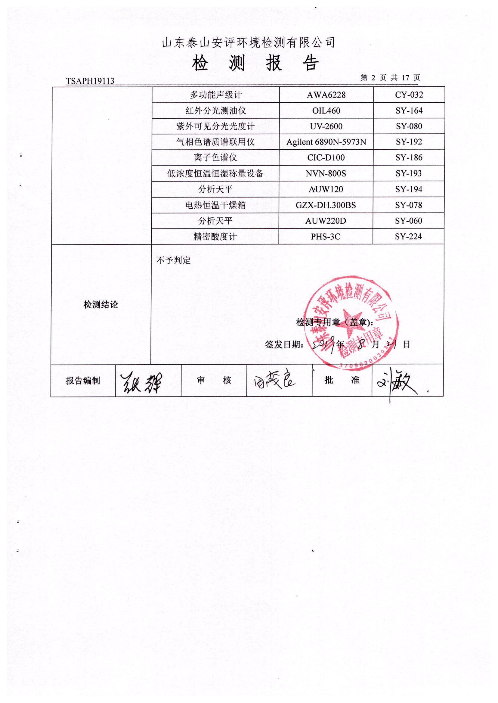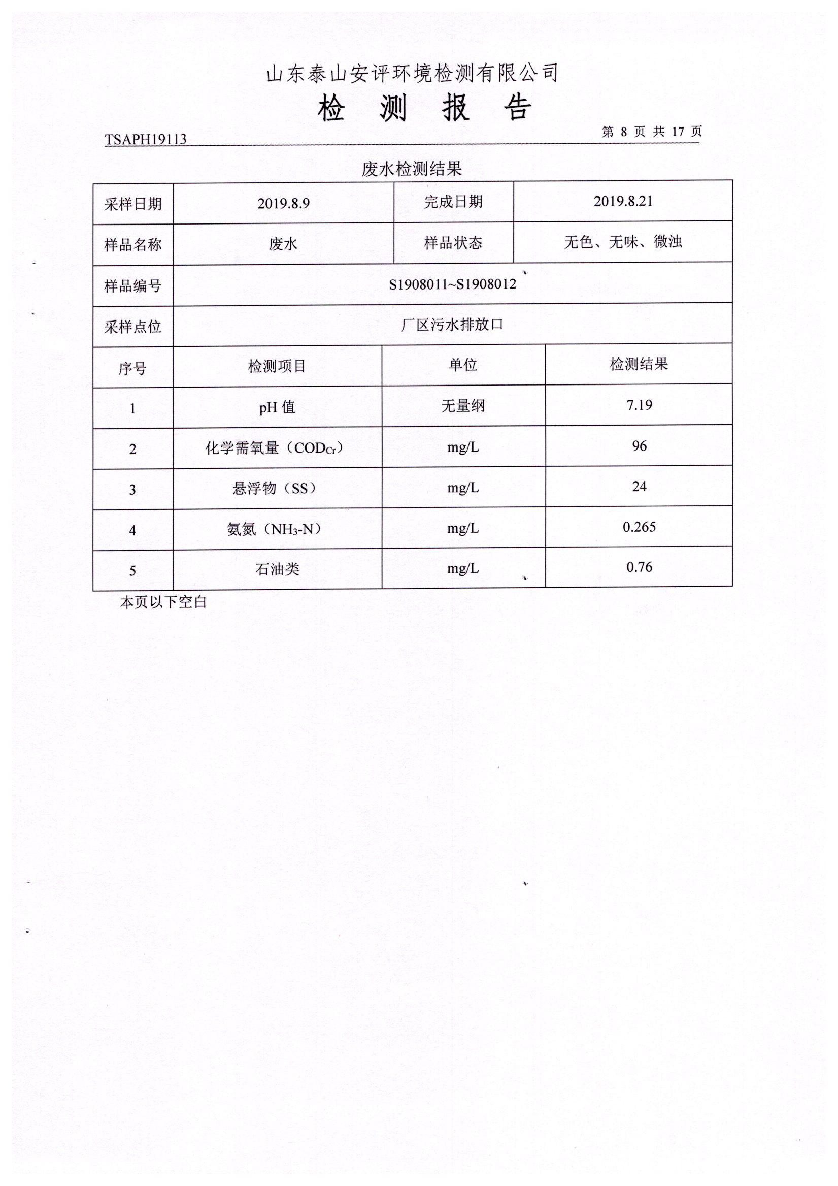500mg/L,NH3-N 45mg/L, SS 250mg/L。實(shí)際監(jiān)測(cè)排放濃度:CODcr 96mg/L,NH3-N 0.265mg/L,SS 24mg/L。污水經(jīng)工業(yè)園區(qū)污水管網(wǎng)排往泰安嘉誠(chéng)水質(zhì)凈化有限公司處理。