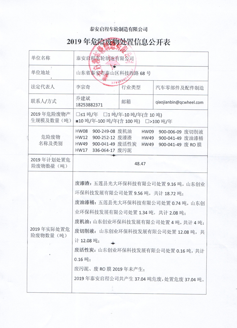 泰安啟程車輪制造有限公司危險(xiǎn)廢物處置信息公開