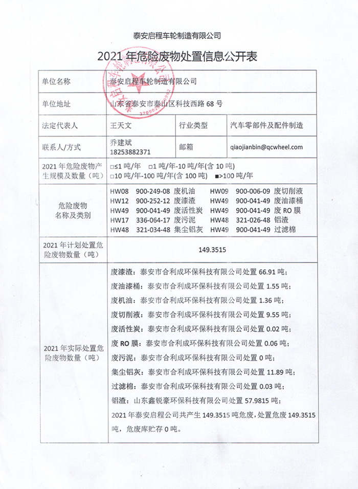泰安啟程車輪制造有限公司危險廢物處置信息公開